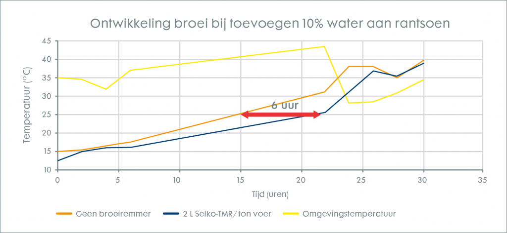 Water jaagt broei aan. In de praktijk en uit proeven blijkt dat het toevoegen van water aan een rantsoen kan zorgen voor een snelle stijging van de temperatuur. Wanneer er dus gisten in een gras of maiskuil zitten, kunnen deze zich hierdoor extra snel vermenigvuldigen. Een proef bij een hoge omgevingstemperatuur liet zien dat het, door het toevoegen van 2L Selko-TMR, meer dan 6 uur langer duurde voor het rantsoen was opgewarmd tot 25°C (figuur 4). Bij toevoegen van water aan het gemengde rantsoen wordt dus aanbevolen altijd 2L Selko-TMR/ ton voer te doseren.