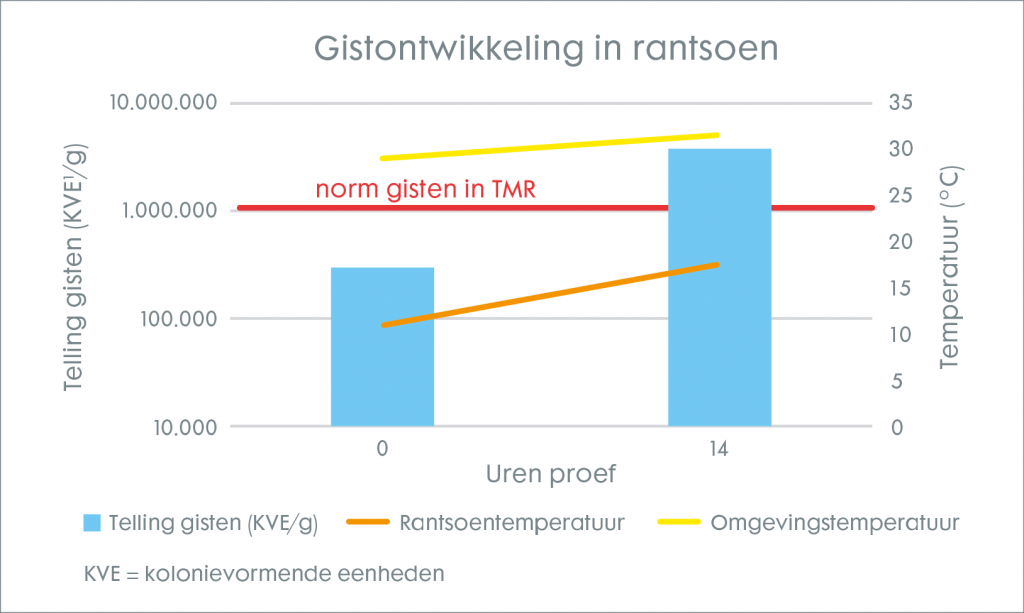Gisten, schimmels en enterobacteriën kunnen zich bij een aanbod van zuurstof enorm snel vermeerderen, wat zorgt voor fermentatie van het voer. Met name gemakkelijk beschikbaar suiker, eiwit en zetmeel wordt omgezet naar CO2 en waterdamp. Hierbij komt ook warmte vrij wat kan resulteren in broei. Er is sprake van broei in het rantsoen bij een temperatuurverschil van 10°C met de buitentemperatuur. Ook bij lage rantsoentemperaturen kan groei van gisten echter al plaatsvinden. In een recente studie (2021) bleek dat het aantal gisten al ruim de norm overschreed terwijl nog geen broei werd geconstateerd (figuur 1).