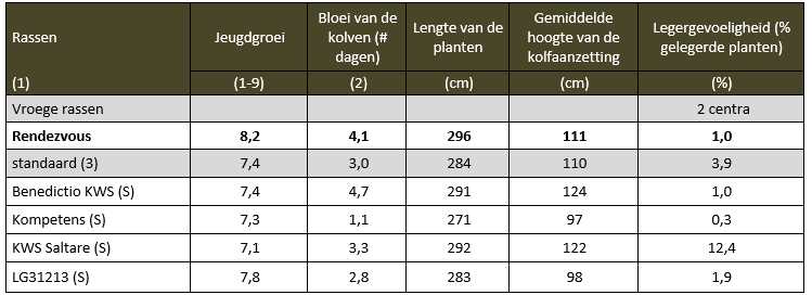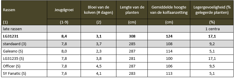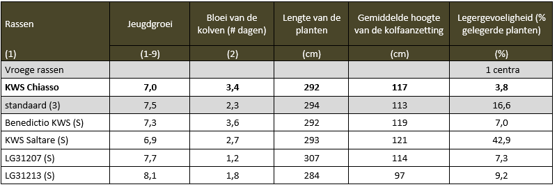 De nieuwe rassen werden vergeleken met de standaarden Benedictio KWS, KWS Saltare, LG31207, LG31213 , Galeano, LG31235, Officer en SY Fanatic. De gegevens zoals jeugdgroei, legering en bloei van de kolven worden weergegeven in tabel 5 en tabel 6. Tabel 7 en tabel 8 geven de resultaten van de opbrengsten, vroegrijpheid en verteerbaarheid weer. Finaal volgt een korte omschrijving van de nieuwe toegelaten rassen.
