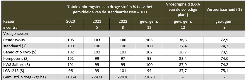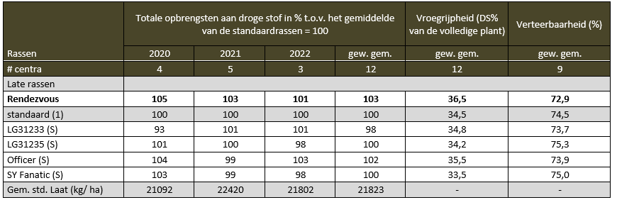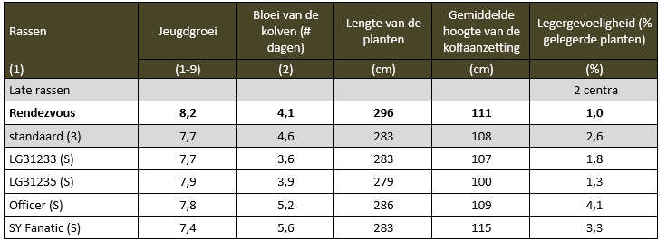 Op de Belgische rassenlijst zijn drie nieuwe kuilmaïsrassen opgenomen: Rendezvous, LG31231 en KWS Chiasso. De officiële rassenproeven werden uitgevoerd door ILVO-Plant (Instituut voor landbouw-, visserij- en voedingsonderzoek Merelbeke) en CRA-W (Département Production végétale Gembloux) in opdracht van de Technische Interregionale Werkgroep voor de samenstelling van de nationale rassenlijst voor landbouwgewassen.