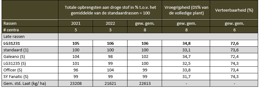 Het nieuwe ras werd vergeleken met de standaarden Benedictio KWS, Kompetens, KWS Saltare, LG31213, LG31233, LG31235, Officer en SY Fanatic. Gegevens zoals jeugdgroei, legering en bloei van de kolven worden weergegeven in tabel 1 en 2. Tabel 3 en 4 geven de resultaten van de opbrengsten, vroegrijpheid en verteerbaarheid weer. Finaal volgt een korte omschrijving van het nieuw toegelaten ras.
