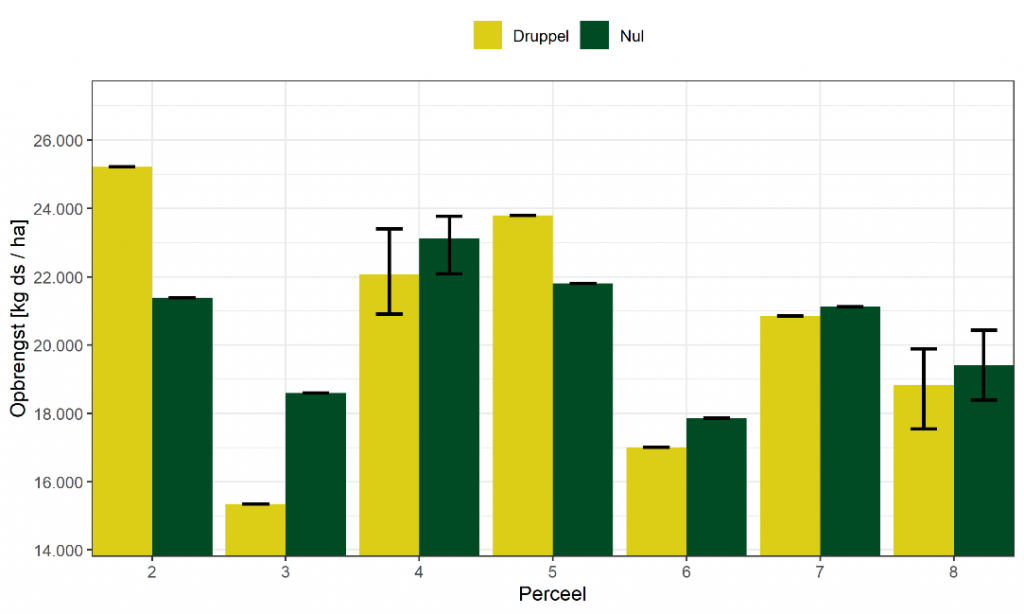 Vocht was daarom niet de beperkende factor in 2021 voor plantgroei en over het algemeen werden er hoge opbrengsten voor mais gerealiseerd. Druppelirrigatie was daardoor overbodig; er was geen verschil in droge stof (figuur 3), stikstof en voederwaarde tussen druppelirrigatie en de referentie. Tevens was er geen verschil in de hoeveelheid minerale stikstof in de bodem na de maisoogst tussen druppelirrigatie en de referentie.