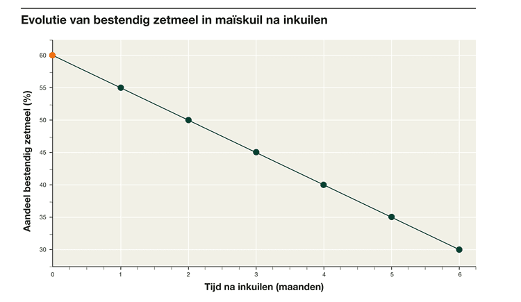 Bij kuilen met een hoog drogestofgehalte is het belangrijk om, zoals elk jaar, rekening te houden met het aandeel bestendig zetmeel. Wordt de kuil al in de eerste maanden na de oogst geopend, dan is het aandeel bestendig zetmeel het hoogst en ligt het gehalte aan FOS (fermenteerbare organische stof) lager. Naarmate de kuil langer ligt, daalt het aandeel bestendig zetmeel en stijgt de FOS. Een te hoog gehalte aan bestendig zetmeel kan een negatieve invloed hebben op de pensgezondheid van melkvee. Overleg daarom steeds met uw voerleverancier, zeker wanneer het rantsoen verrijkt wordt met andere zetmeelbronnen of krachtvoer.