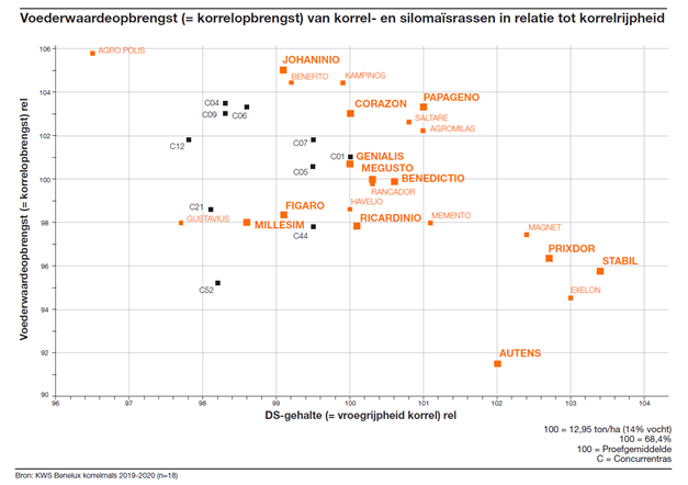 Bij oogst op het juiste moment is de opbrengst van de korrel dominerend in de silomaïsproeven, wat tot uiting komt in hoge drogestof- en voederwaardeopbrengsten. Daarnaast is ook de hoogte van de VEM en de zetmeelindex een goede indicator van de kwaliteit van het desbetreffende ras.