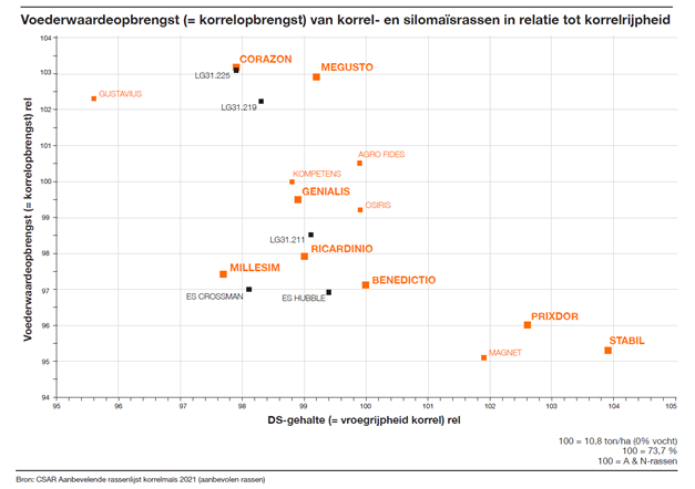 Maïsrassen die zich in de proeven, maar ook in de praktijk hebben bewezen zijn onder andere PRIXDOR, PAPAGENO, MEGUSTO, GENIALIS EN CORAZON. Ook nieuwkomer JOHANIIO scoort hoge ogen. Ten opzichte van heel veel andere maïsrassen behalen deze al gauw een 200-250 euro meeropbrengst per hectare. Verhalen als zouden deze rassen enkel geschikt zijn als korrelmaïs, kunnen naar het rijk der fabelen. Hun vooraanstaande positie op de verschillende silomaïsrassenlijsten in voederwaarde (VEM/kg ds en zetmeel) tonen juist het tegenovergestelde aan. Een maisgewas als bijvoorbeeld GENIALIS met als doel deze te dorsen voor de korrel, is dezelfde GENIALIS die op een ander perceel juist als silomaïs wordt geoogst. Er zijn er die anders doen geloven, maar zo duidelijk is het!