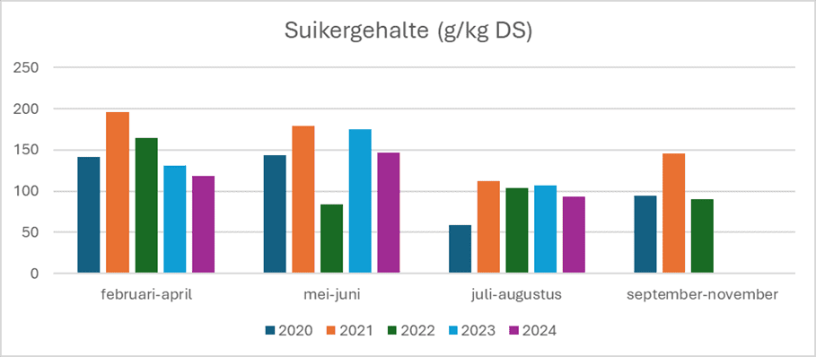 De droge zomers van 2020 en 2022 hadden een merkbare invloed op het VEM-gehalte van vers gras in de voorjaarsmaanden (mei-juni) en de zomermaanden (juli-augustus). Ten opzichte van de andere jaren bevatte het vers gras toen minder VEM/kg DS (tot ruim 50 VEM/kg DS minder in 2020) (Tabel 2). De droge zomers hadden ook een effect op het DS-gehalte in juli-augustus, waarbij het DS-gehalte zo’n 50 g/kg hoger lag dan in de andere jaren. 2024 was het natste jaar sinds het begin van de metingen en dat zagen we terug in een laag DS-gehalte van het vers gras in het (vroege) voorjaar. Ook het suikergehalte lag dat jaar duidelijk lager (Figuur 1). Deze weersinvloeden leidden ook tot de verschillen tussen de geanalyseerde gegevens en de CVB-waarden, die van minder extreme jaren dateren.