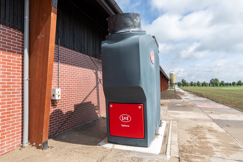 Lely Sphere, een innovatie die de stikstofuitstoot in de stal met gemiddeld 77% vermindert en de ammoniak die vrijkomt omzet in circulaire meststof. Het systeem scheidt drie mineralenstromen met het filtersysteem: